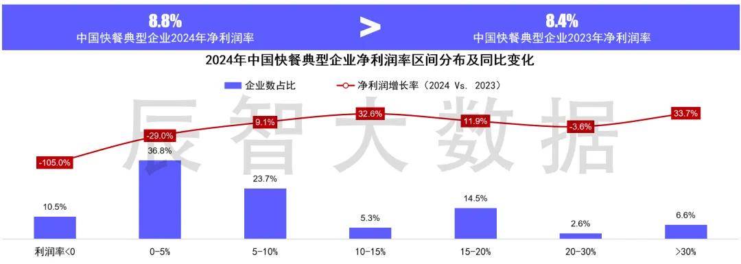 从各区间净利润同比变化来看,净利润率超30%的企业2024年净利润同比增长率最高,而净利润率低于5%甚至负净利润率的企业2024年净利润同比增长率明显低于其他企业,“强者愈强、弱者愈弱”的马太效应在快餐市场上正逐渐体现。
