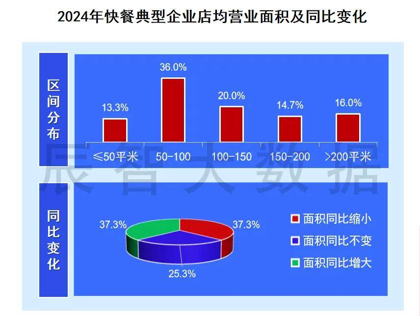 从2024年快餐店型企业的店均营收面积来看,店均营业面积50-100平方米的企业占比36%,小店型是快餐门店营业面积的首选,同时37.3%的快餐企业同比在缩减门店面积。