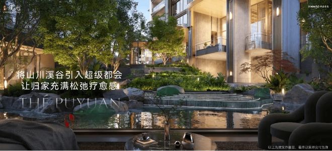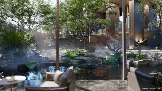 :外立面采用玻璃、铝板与专属定制的金属釉陶艺结合,形成动态光影体系,赋予建筑更多生命力与动感。社区内首创“疗愈式垂直峡谷生态体”,近7米高差下沉庭院搭配约8.3米架空层挑高空间,将峡湾、密林、溪涧、山丘融入园林景观,形成流动的感官通廊。